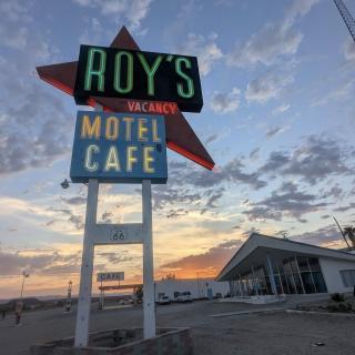 Welcome to Roy’s Motel & Café. A timeless icon of Route 66 nestled deep in the Mojave Desert. Since 1938, Roy’s has served travelers as a gas station, café, auto repair shop, and rest stop, all wrapped in sweeping Googie-style architecture and crowned by its legendary neon boomerang sign. Though the motel remains closed for now, its iconic gas pumps, vintage signage, and gift shop continue to carry on the spirit of the Mother Road, welcoming travelers from around the world to experience a true Route 66 landmark. Today, Roy’s enters a new phase of care and restoration, dedicated to preserving Amboy’s legacy and mid-century character for generations to come.