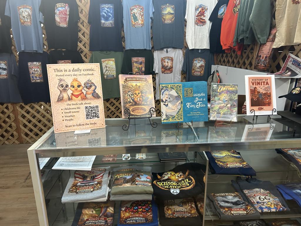 The Scissortail Flycatchers Gift Shop is a one-of-a-kind stop in Vinita, Oklahoma, bringing local culture to life through original comic characters inspired by the state bird. Located inside a charming antique mall right on historic Route 66, our shop offers a unique mix of books, stickers, apparel, plushies, postcards, and collectibles you won’t find anywhere else.